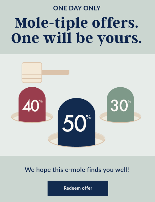 2023 w3 Silver award winner. Amazing client to work with, and when initially asked & tasked with changing the tone/feel of the “Mystery Sale” campaign emails, we leaned into clean, simple, punny, and slightly funny.